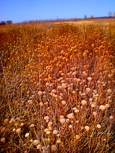 Last year’s prairie field — stands colorful as urban sprawl grows near.